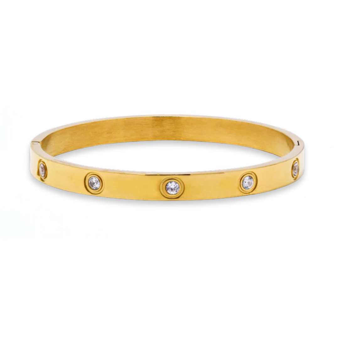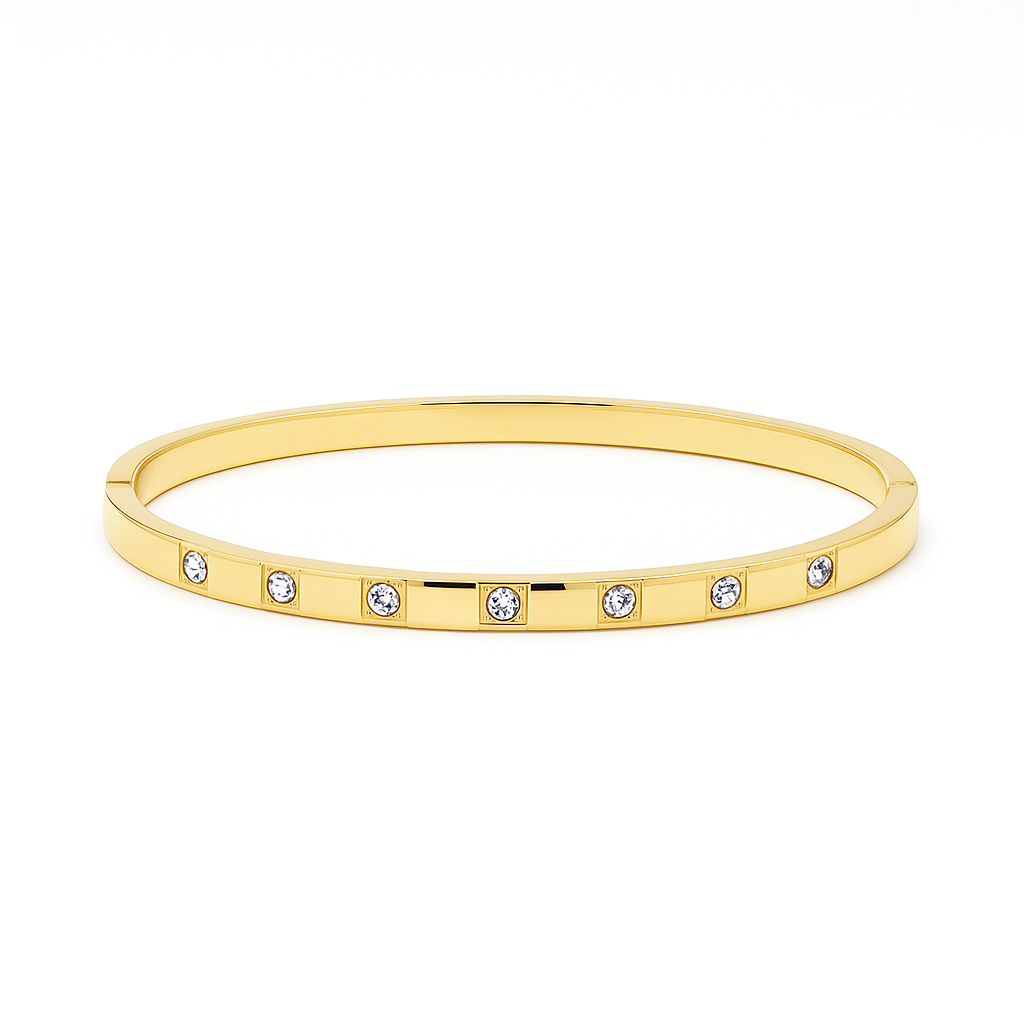 A sleek gold‑tone bangle punctuated with bezel‑set stones for a quiet, everyday glow. Minimal and stackable. Product Details Main Material: Stainless steel (gold‑tone finish) Features: Waterproof; tarnish-free; hypoallergenic Stones: Cubic zirconia accents (bezel set) Profile: Slim, smooth-edge closed bangle Style: Minimal, stackable, modern